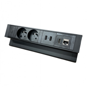 - Bloc Exit de bureau, noir, en saillie, 2 prises, 2 ports USB, 1 port CAT6, 1 connexion HDMI